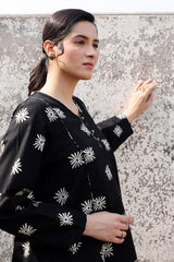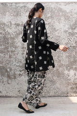 Classic-fit paneled printed shirt with a V-neckline adorned with loop buttons along the front slit, paired with a complementary printed khula poncha shalwar for a graceful look.