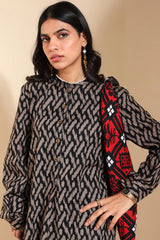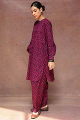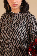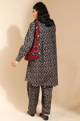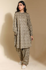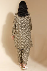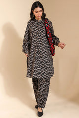 A relaxed-fit printed shirt with a low band neckline and buttons along the front placket, styled with cuffed sleeves, a rounded hem, and side pockets for ease. Paired with a matching printed classic-fit shalwar for a coordinated look.