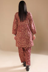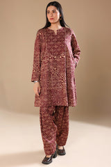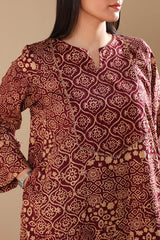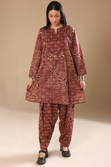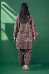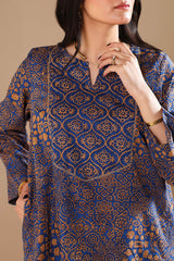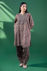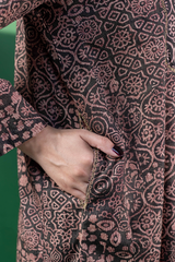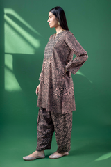 An A-line printed shirt with a round neckline and V-slit, featuring delicate embroidery on the bodice. Side pockets add functionality and ease. Paired with a printed classic-fit shalwar for a relaxed yet refined look.
