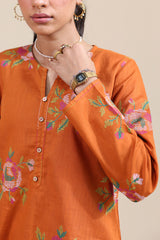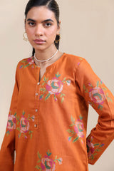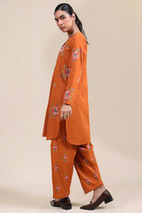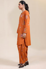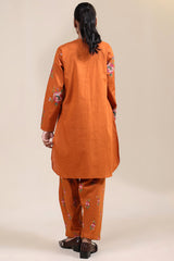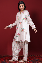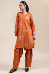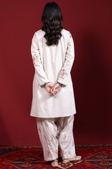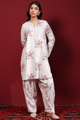 Cross-stitch embroidered classic-fit shirt with a round neckline and V-slit, adorned with buttons along the front slit and finished with a round hem. Paired with a matching embroidered classic-fit shalwar.
