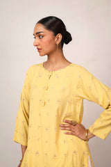 A formal paneled kurta features a round neckline with a V-slit, enhanced with intricate sequin detailing and buttons on the front slit. The kurta is further adorned with embroidered motifs, embellished with sequin work, while the sleeve hems are also beautifully enhanced with delicate sequin detailing.