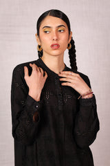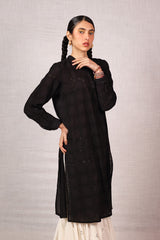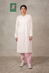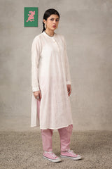 A refined silhouette ‘Fling of Spring’ kurta, featuring a band neckline adorned with button details on the placket. The kurta is enriched with self-embroidered details and fine custom-made schiffli detailing, while the cuffed sleeves are accented with delicate button embellishments. Can be paired it with any Gen fit for a versatile look.