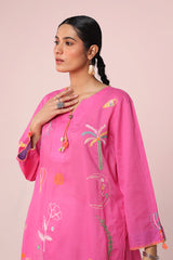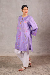 A relaxed-fit embroidered kurta features a round neckline with a V-slit, adorned with vibrant stitch detailing and a fun tassel embellishment. Delicate, colorful embroidered motifs enhance the overall look, while the sleeve hems are finished with subtle dori stitching and tassel accents. Perfect to pair with any generation fit for a versatile, stylish ensemble.