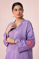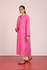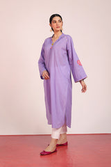 A loose-fit solid-hued kurta features a band neckline with a V-slit, adorned with intricate stitching and tassel details. The gathers around the neckline add volume, while the striking embroidered detail on the shoulders and back create a bold visual. The sleeve hems are embellished with Dil motif and stitched hems for added elegance. Can be paired with any generation bottoms for a chic look.