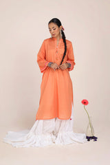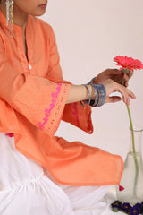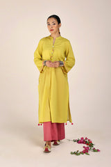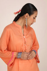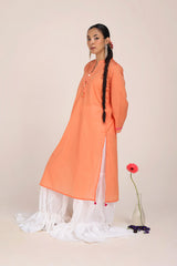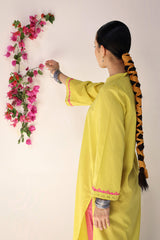 A solid-hued dotted textured A-line kurta features a band round neckline with a V-slit, enhanced by intricate lace on the pockets and detailed with vibrant tassels. The sleeve hems are adorned with delicate lace trims and vivid embroidery, offering a versatile, stylish look.