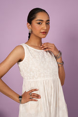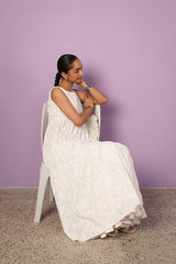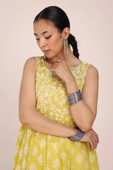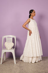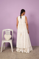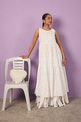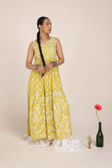 A long-tiered flared frock features a round neckline and a delicately screen-printed floral bodice. Cinched sleeves add structure, while soft gathers create a graceful, flowing silhouette. The flare is further adorned with floral motifs, making it a versatile piece to pair with any gen fit.
