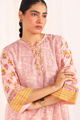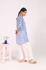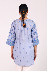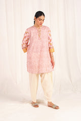 A block-printed kurta featuring a round neckline and V-slit, adorned with a contrasting printed placket and playful tassel detailing. Subtle pleats at the back add charm. Can be paired effortlessly with any generation bottoms for a complete look.