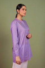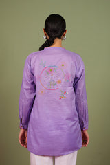 An embroidered top with a round neckline, featuring delicate stitching along the neck, shoulders, and placket. Feminine floral motifs elevate the front, while cuffed sleeves offer a refined finish. Embroidery at the back adds a lively, graceful touch.