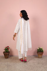 A classic-fit, printed paneled kurta with a round and V-style neckline, adorned with delicate bead and tassel detailing. The sleeve hems are enhanced with a delicate lace trim. This versatile piece can be paired with any generation of fits for a stylish look.