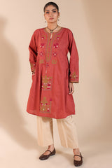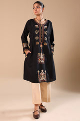 An A-line paneled kurta with a round neckline and V-slit, adorned with buttons along the front placket. Accented with appliqué work and designed with convenient side pockets.