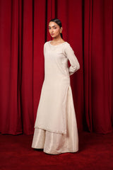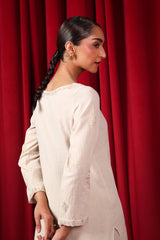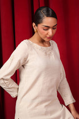 A formal straight-cut kurta in crinkle cotton fabric, featuring a round neckline with delicate tilla embroidery, motifs on the sleeves, and embroidery on the front and back hemline.