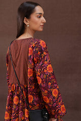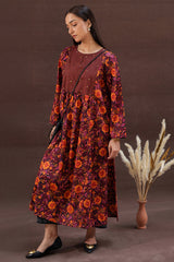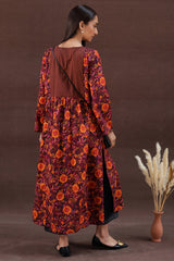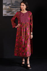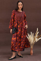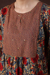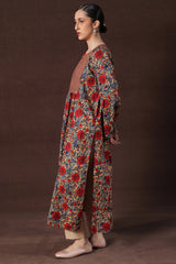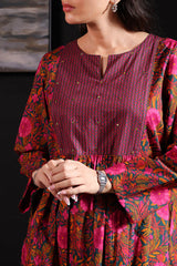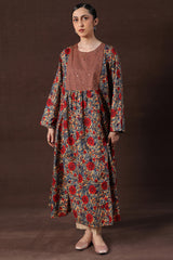 A long flared printed shirt with a round neckline and V-slit. The bodice is adorned with mukaish accents, while the gathered waist adds a graceful flare. Can be paired with any Generation bottoms for a complete look.