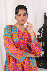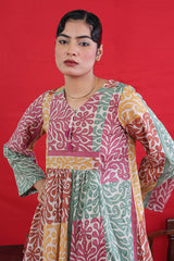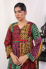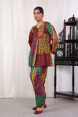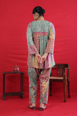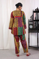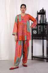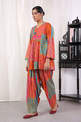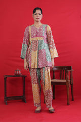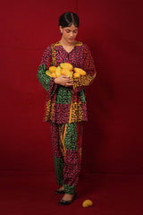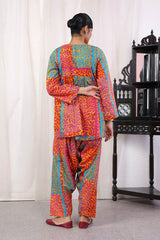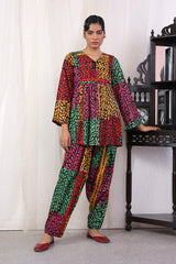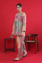Print blocked short peplum top with gather details on front and back and tassel details at V neckline. Paired with a matching printed classic fit shalwar.