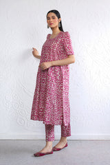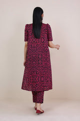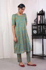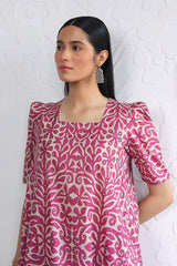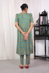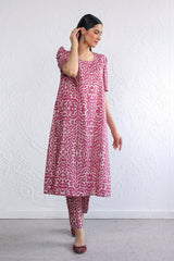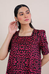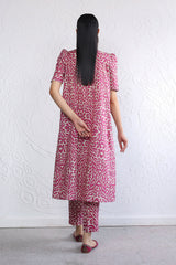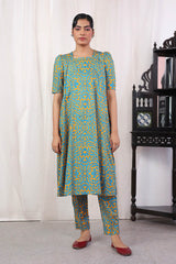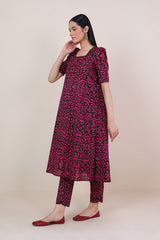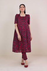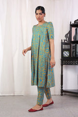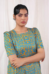Printed puff sleeves, A-line shirt with square neckline, paired with straight fit printed pants.