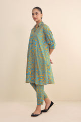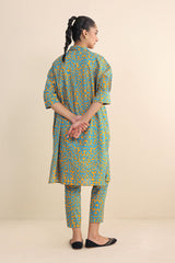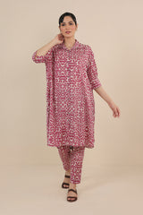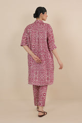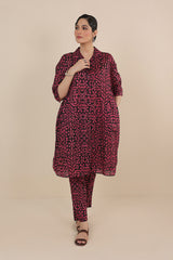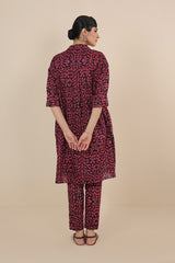 Front open, collared bat wing sleeves fluttering sleeves. Paired with straight fit pants.