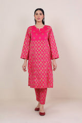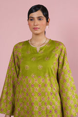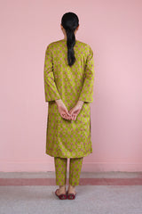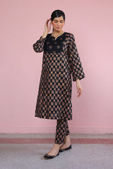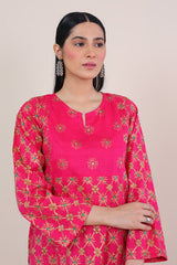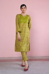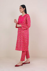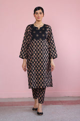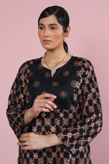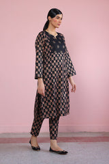 Print blocked A-line kurta with mukaish details on bodice, paired with matching printed straight pants.
