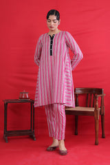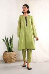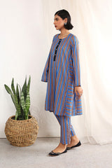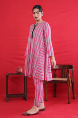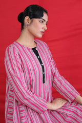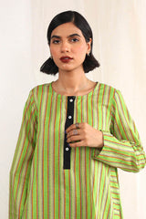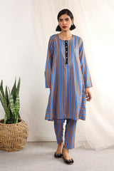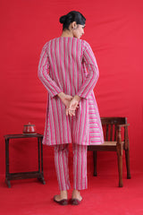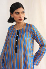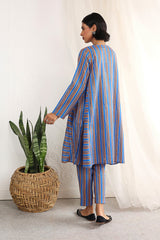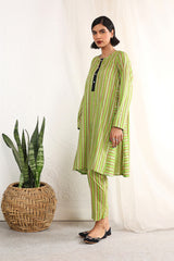 A-line kurta with round neckline and full sleeves, along with buttons on placket. Paired with straight fit pants.