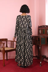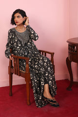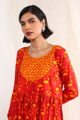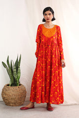 Print blocked anarkali frock with gathers at tassel detailing at the front.