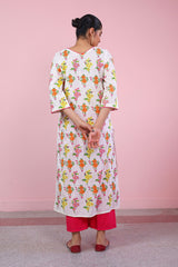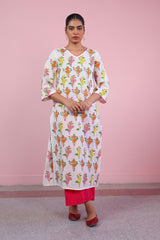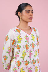Hand block printed, V-neckline shirt with crochet details on sleeves & neckline.