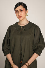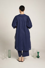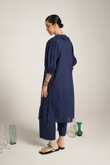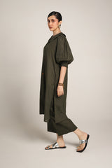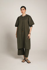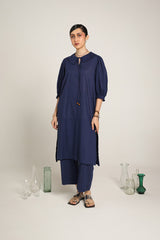 Embrace minimalist elegance with this solid-hued easy-fit kurta, featuring a round neckline with a pan collar style. The slit is enhanced with tassel details, while gathers around the sleeve hems add a touch of charm. Paired with matching classic culottes, this ensemble is a perfect blend of simplicity and contemporary style.