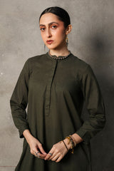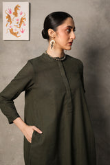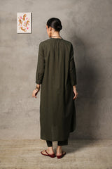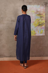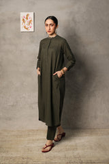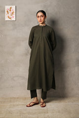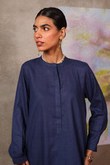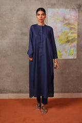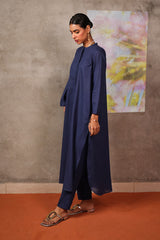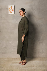 A fitted kurta with a band neckline, featuring buttons hidden in the front placket and cuffed sleeves, with side pocket detail. Paired with matching solid straight fit trousers.