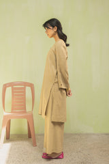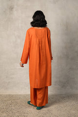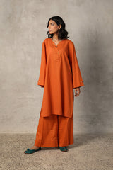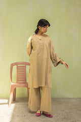 A solid-hued cord set featuring a classic fit kurta with a round neckline and a V-slit, enhanced with minimal criss-cross stitch detailing and a button accent. The sleeve hems mirror the stitch and button details for a cohesive touch. Paired with matching solid classic culottes for an effortlessly polished look.