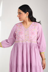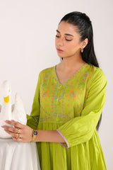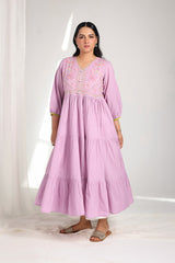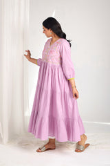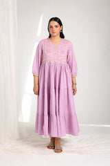A handcrafted tiered frock with a V-neckline, featuring delicate hand embroidery and tassel accents on the bodice. Cinched sleeves add charm, while gathered tiers create a soft, feminine flare. The back is adorned with Mughal bagh embroidery. Can be paired with any generation bottoms for a complete look.
