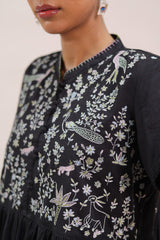 An embroidered flared dress featuring stitch detailing on the neckline and loop buttons on the front placket. The bodice is enhanced with embroidery, while the sleeve hems are adorned with lace trim. Can be paired with any Generation bottoms for a complete look.