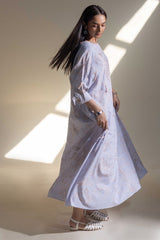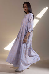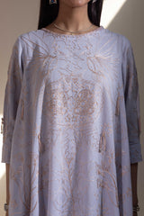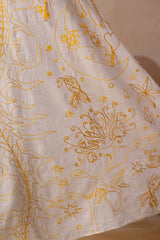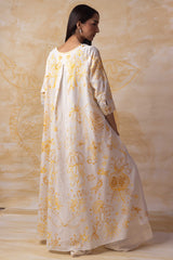 Aari embroidery graces this long A-line shirt, showcasing fine craftsmanship and timeless appeal. The round neckline is accented with subtle stitch detailing and cuffed sleeves, complemented by side pockets for ease. Finished with knot tassels and back pleats that add movement and subtle structure.