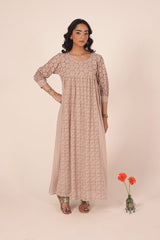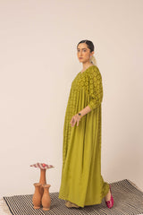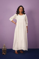 An exclusive, custom-made Schiffli-patterned classic-fit frock featuring a round neckline. The gathered empire waist adds a comfortable, flowing flare to the silhouette, while the cuffed sleeves are enhanced with button detailing. Can be paired effortlessly with any Generation fits.