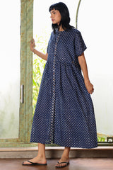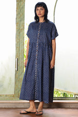 Indie Block front open dress with button details on placket. The dress has gathers on waist and turned up sleeves.