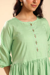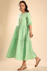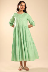 Classic-fit long flared tiered dress with a round neckline and buttoned front placket, finished with cinched sleeve hems. Designed with soft gathers throughout for a flows silhouette.