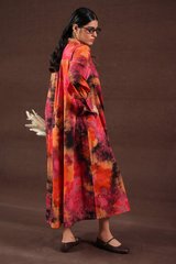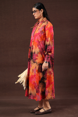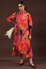 Splashy printed long A-line dress, designed with a collar neckline and buttoned front placket. Finished with cuffed sleeves, this lively piece brings a burst of color with flair.