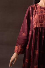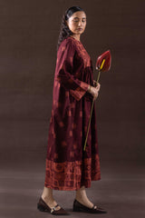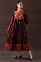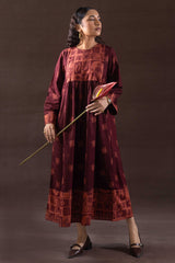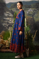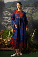 A long flared printed dress with a round neckline and soft gathers, creating a graceful, flowy silhouette. Finished with a keyhole detail and gentle gathers at the back for a classic look.