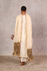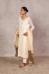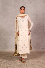 An exquisitely embroidered panelled kurta with a V-neckline, featuring intricate adda work and delicate sequin accents. Scattered motifs adorn the kurta, with detailed embroidery on sleeve hems. Comes with a dupatta trimmed in golden borders and kiran detailing, a comfortable inner lining. Paired with straight-fit trousers for a timeless, elegant look.