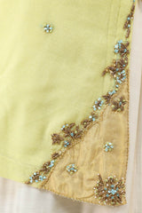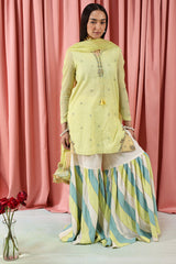 An embroidered formal classic-fit shirt with a round neckline and v slit, adorned with tassel detailing. The shirt features intricate tilla and sequin work, paired with a traditional chatta patti gharara and a comfortable inner. Styled with a dupatta finished with a chatta patti border and kiran accents.