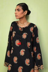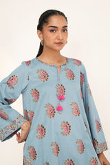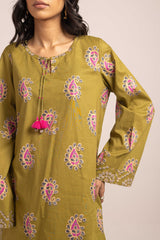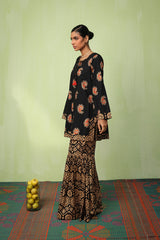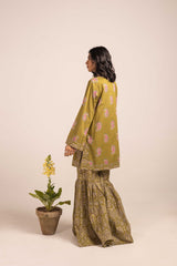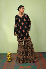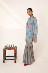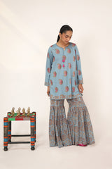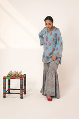 A classic-fit kurta adorned with shimmering gotta glow paisley motifs all over, featuring a round neckline with a V-slit. The slit is enhanced with vibrant tassel details, adding a playful touch. This mid-length kurta is paired with a contrasting printed flared gharara, creating a striking blend of tradition and vibrance.