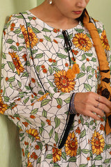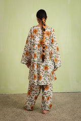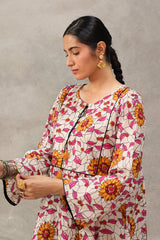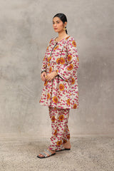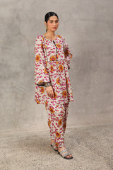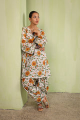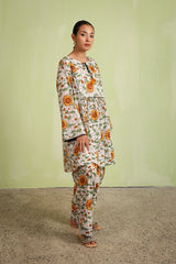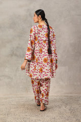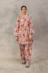 An easy-fit glass-stained printed peplum top featuring a round neckline with a tassel detail. The bodice is enhanced with dori piping, while gathers around the empire waist create a flowing flare to the silhouette. Dori piping detail also adorns the sleeve hems. Paired with a matching printed classic farshi shalwar, accented with stitching detail along the ankle hemline.