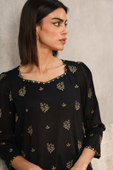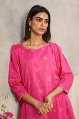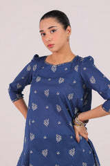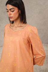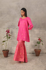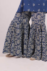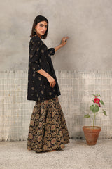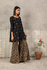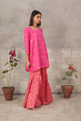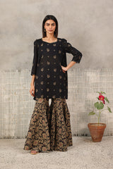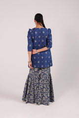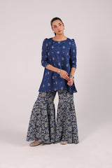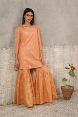 A classic fit printed kurta featuring a square neckline, elegantly enhanced with Mukesh detailing. The sleeve hems are also adorned with intricate Mukesh work, celebrating the art of jacquard. Paired with a classic printed gharara for a timeless and graceful look.