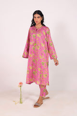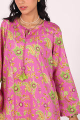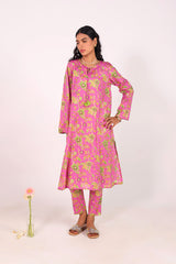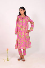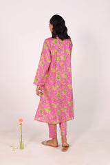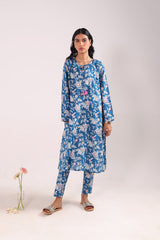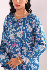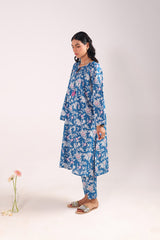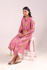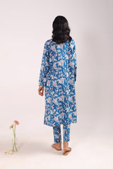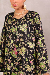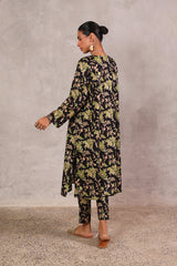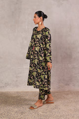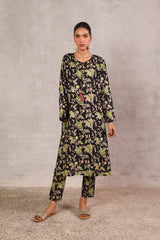 A classic-fit floral printed kurta with a round neckline and V-slit, adorned with delicate tassel detailing. The soft, lively floral print exudes sophistication and class. Paired with matching straight-fit printed trousers for a complete elegant look.