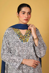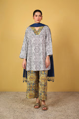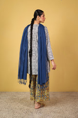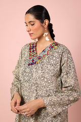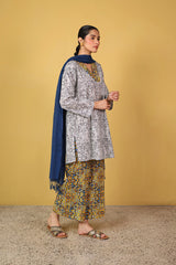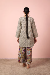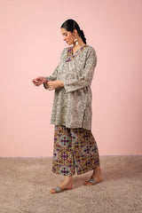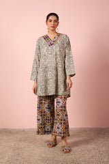 An easy-fit printed kurta featuring a flattering V-neckline highlighted with vibrant tile patterns. Paired with contrast printed culottes bursting with color, this set blends comfort and playful charm for a lively, everyday statement.