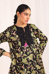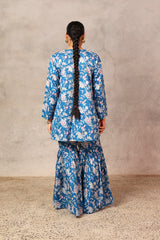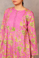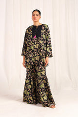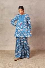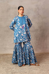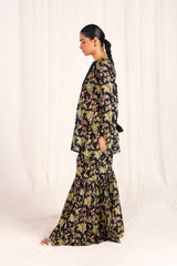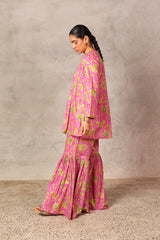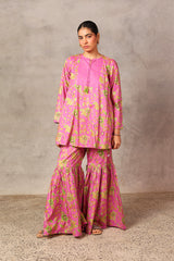 A relaxed-fit kurta in a vibrant gul-bahar print, featuring a round neckline with a V-slit and playful tassel detailing. The bold floral pattern brings a fresh and lively energy to the outfit. Paired with a matching printed gharara, it creates a chic and stylish look.