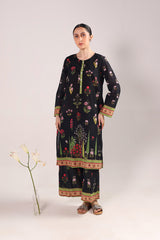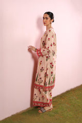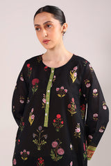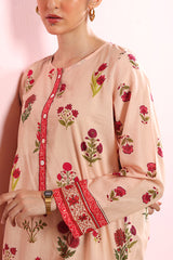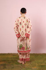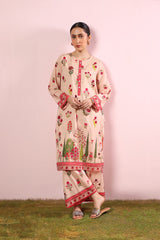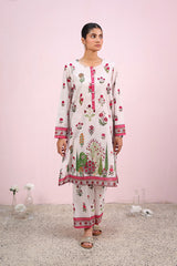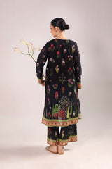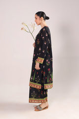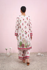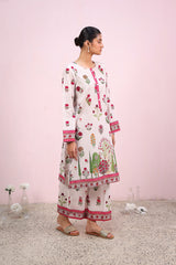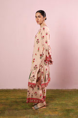 A regal, vibrant floral printed kurta with a round neckline and delicate buttons adorning the front placket. The lively floral motifs evoke timeless elegance. Paired with matching printed culottes, this ensemble seamlessly blends traditional charm with modern sophistication.