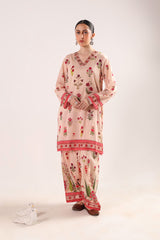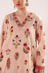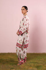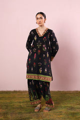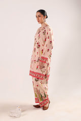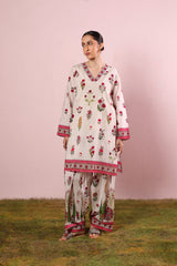 A paneled, vibrant floral printed kurta with a V-neckline. Bursting with bold, blooming florals full of charm. Paired with a matching printed farshi shalwar accented with stitching detail on the ankle hem for a flowing, graceful look.