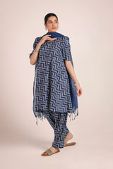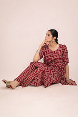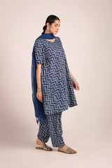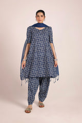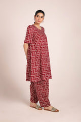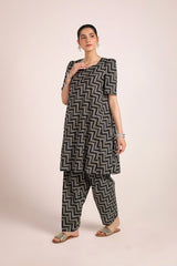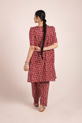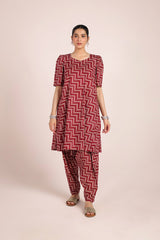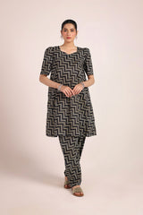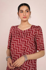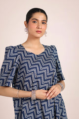 A relaxed-fit A-line shirt featuring a subtle zigzag-inspired print and a V-neckline for a flattering touch. Soft puff sleeves enhance the silhouette. Paired with a matching printed classic-fit shalwar for an effortlessly stylish look.