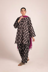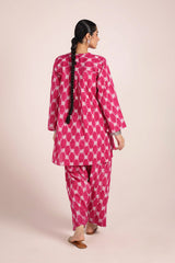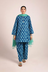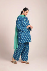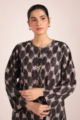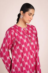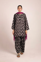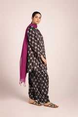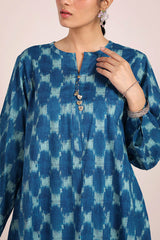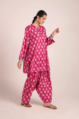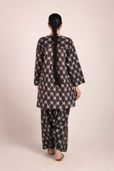 A relaxed-fit, ikkat-inspired printed kurta featuring a round neckline with a V-slit, adorned with gota tassel detailing. The ikkat-style prints echo the richness of woven textures, offering an artisanal and authentic appeal. Paired with a khula poncha shalwar, finished with stitching on the ankle hemline.