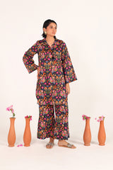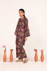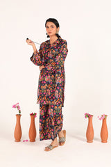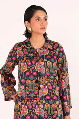 A classic-fit kurta featuring a collar band neckline with charming tassel detailing. The lively print blends vibrant folk-inspired motifs and rich traditional colors. Paired with matching printed culottes for a fresh, vibrant ensemble.