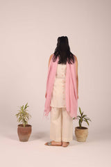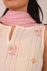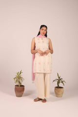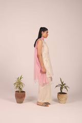 A classic-fit block-printed kurta with a round neckline and V-slit, adorned with soft pastel floral motifs. The neckline and sleeve hems are accented with delicate bead detailing. Paired with culottes for a soft, stylish look.