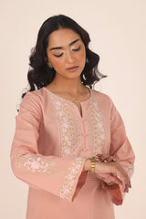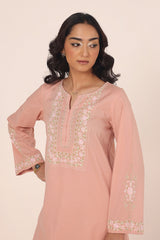 A solid-hued straight-fit kurta featuring a round neckline with a V-slit, adorned with delicate buttons on the front placket. The bodice is elevated with soft pastel-hued Taj embroidery, mirrored on the sleeves for a cohesive look. Embroidered borders further enhance the design. Paired with solid-hued, classic straight-fit trousers for an elegant finish.
