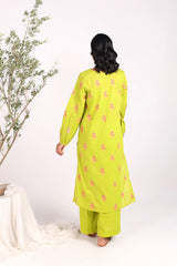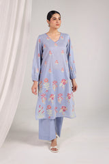 A floral block-printed, classic-fit kurta featuring a V-neckline adorned with delicate stitching details. Vibrant block-printed motifs are enhanced with subtle embroidery, adding depth to the design. Cinched sleeve hems are finished with fine stitching accents. Paired with solid culottes for a balanced, effortless look.